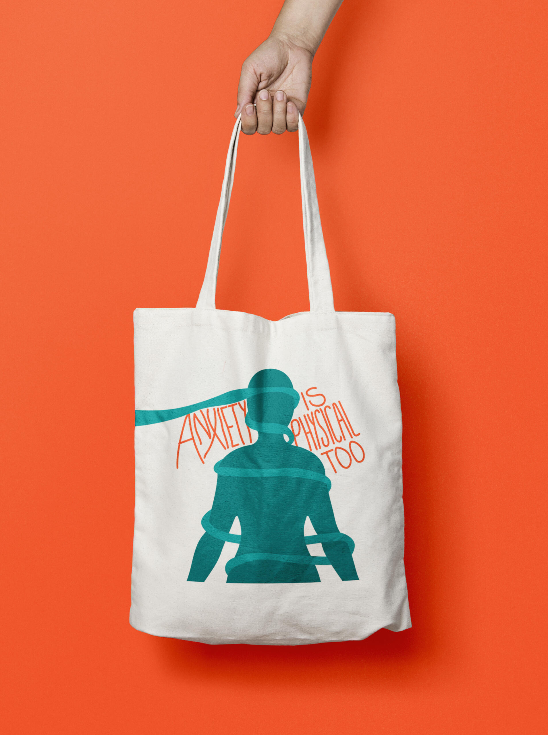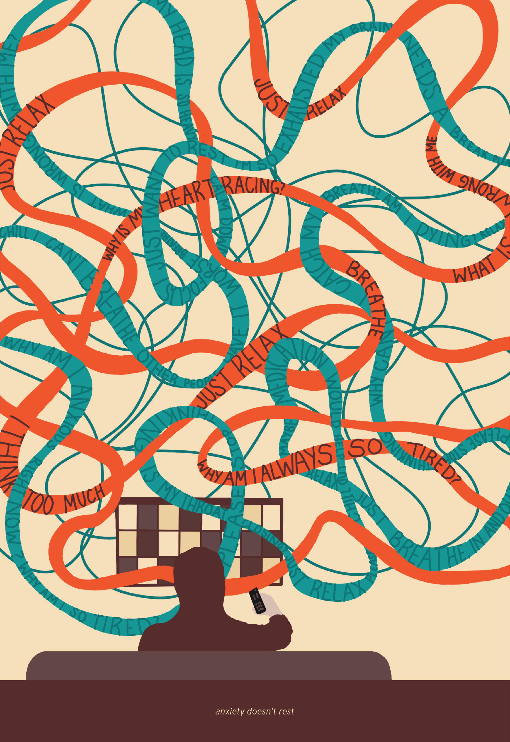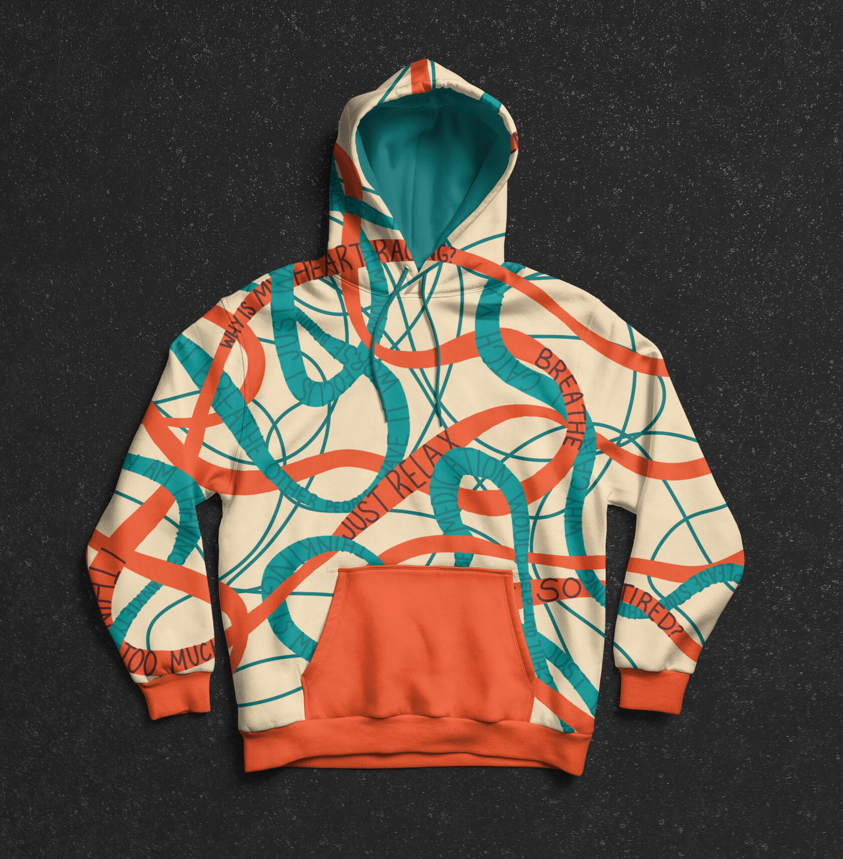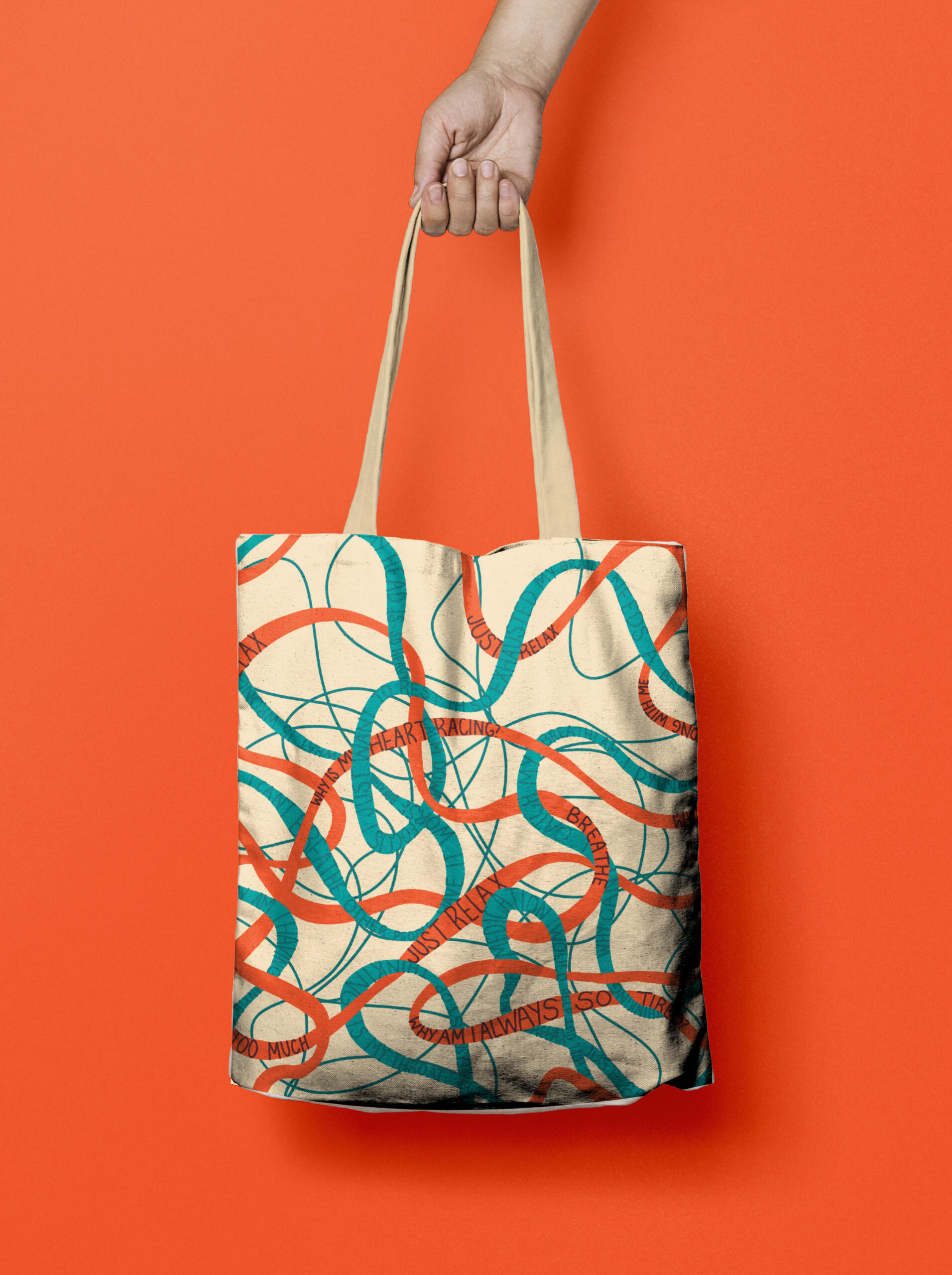 For my social awareness campaign, I embraced a topic close to me: mental health. There is a strong stigma against mental health in our society. Because of this, I waited almost ten years of experiencing symptoms to seek help. I’ve had experience with physical symptoms caused by anxiety, and I had no clue that mental health complications could cause a physical reaction. My goal with this project was to raise awareness about this and show the helplessness people can feel when struggling with their mental health.I started this campaign by creating a series of three posters in which endless racing thoughts cloud a gender-neutral figure. I selected a color palette that expresses the highs and lows of struggling with mental health. I hoped the viewer would feel anxiety looking at it so they could relate to how some people feel daily. I also added a short sentence at the bottom of each poster to exemplify my concept. They say, “anxiety feels never-ending,” “anxiety doesn’t rest,” and “anxiety follows you everywhere.”I created a brochure for people who may not know as much about anxiety. It explains what anxiety is, how the body reacts to it, what helps treat it, and what people can do to help someone with anxiety. I carried over the string/ribbon motif from my drawings and used this same motif to create some stickers, tote bags, and a hoodie design. These items can be displayed or worn to normalize talking about mental health and help eliminate the stigma.