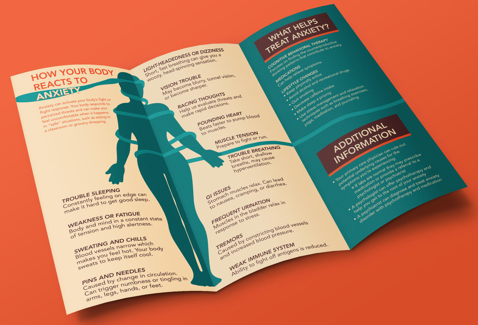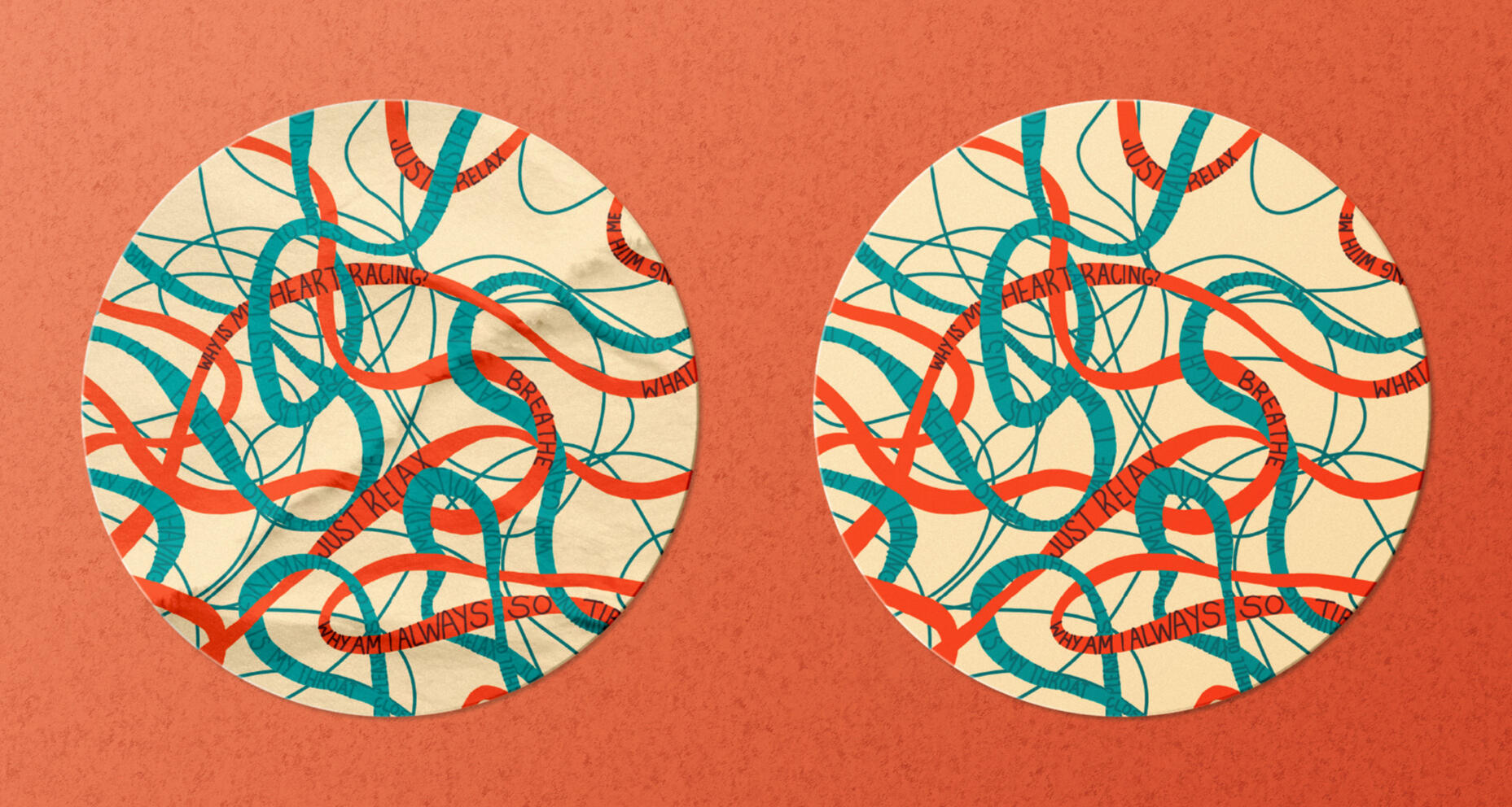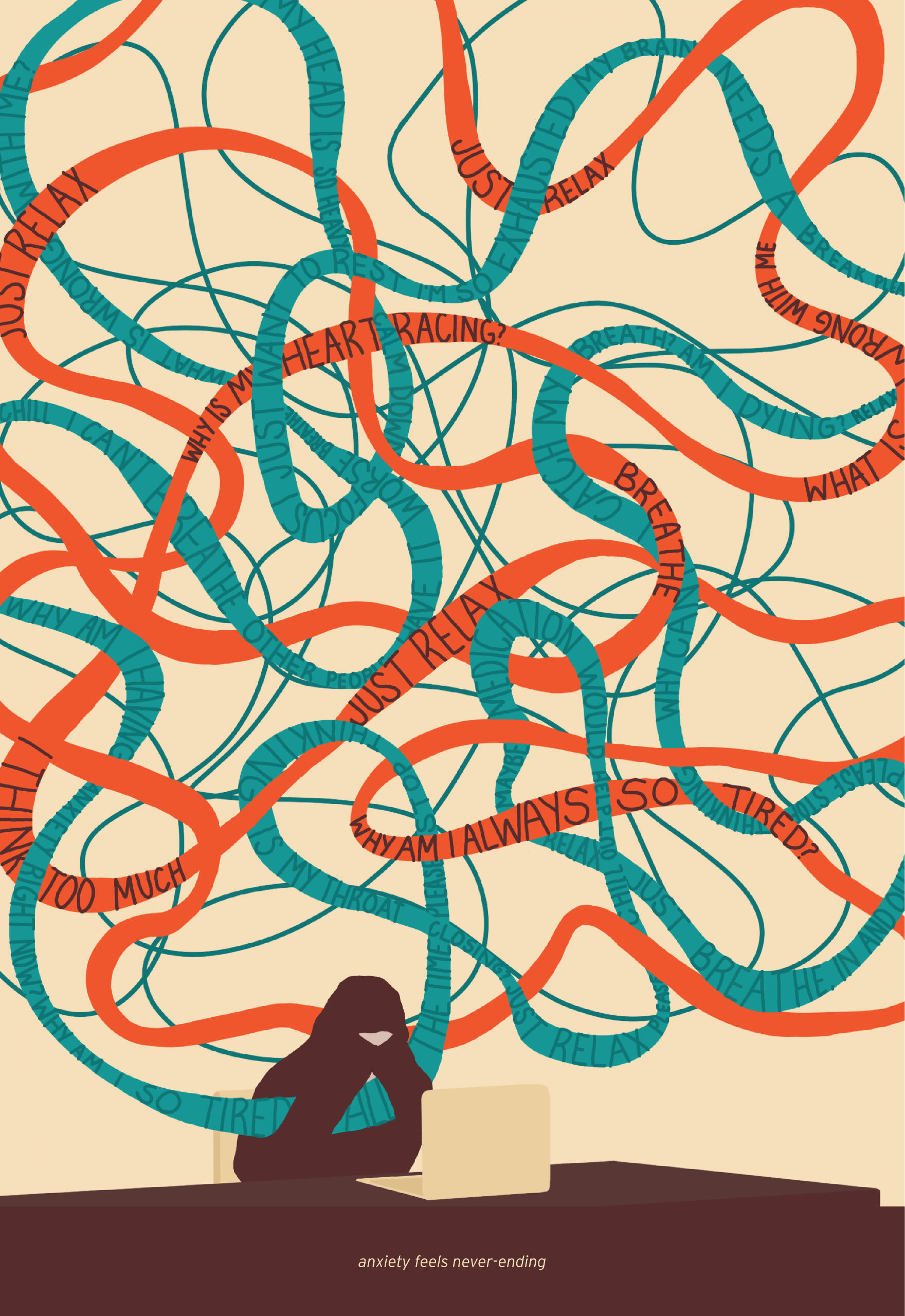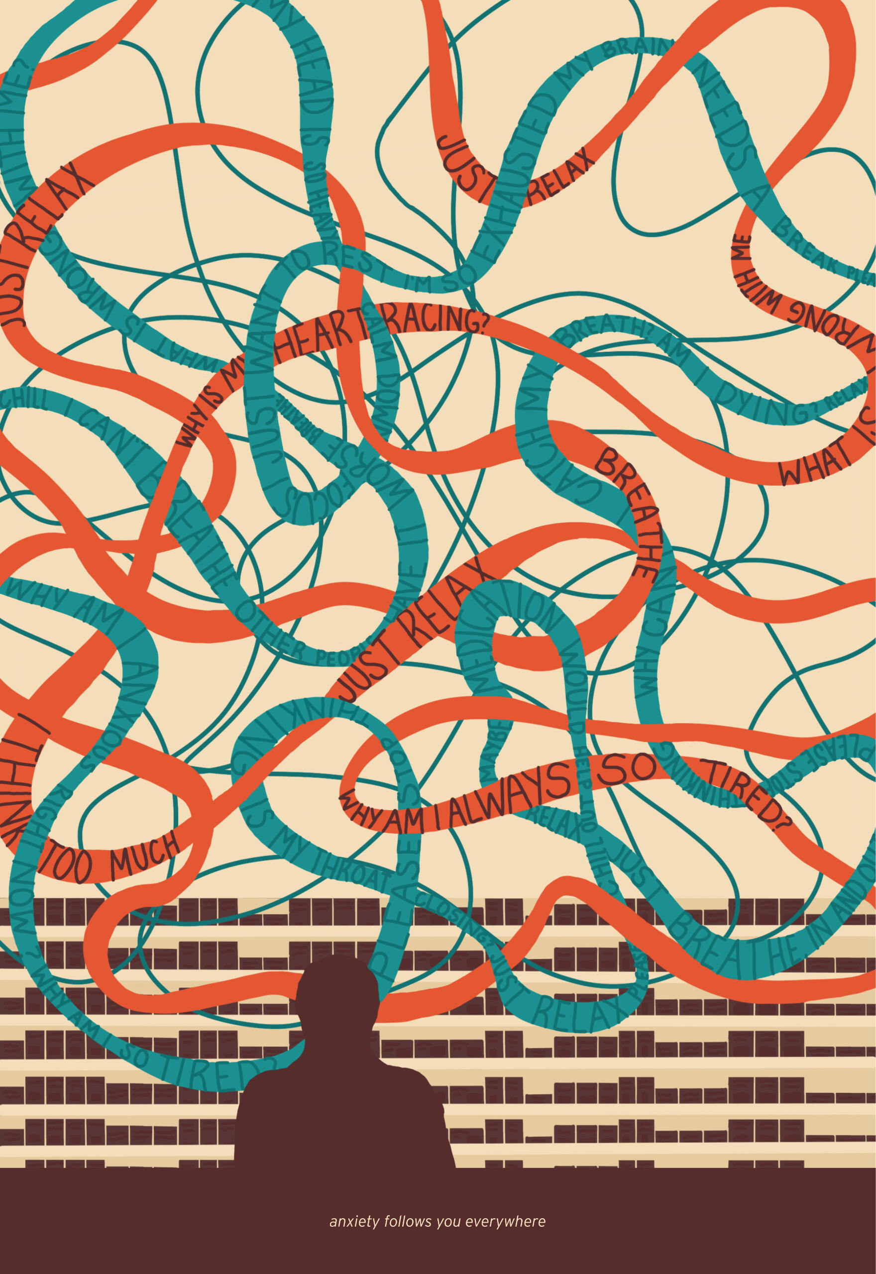For my social awareness campaign, I embraced a topic close to me: mental health. There is a strong stigma against mental health in our society. Because of this, I waited almost ten years of experiencing symptoms to seek help. I’ve had experience with physical symptoms caused by anxiety, and I had no clue that mental health complications could cause a physical reaction. My goal with this project was to raise awareness about this and show the helplessness people can feel when struggling with their mental health.I started this campaign by creating a series of three posters in which endless racing thoughts cloud a gender-neutral figure. I selected a color palette that expresses the highs and lows of struggling with mental health. I hoped the viewer would feel anxiety looking at it so they could relate to how some people feel daily. I also added a short sentence at the bottom of each poster to exemplify my concept. They say, “anxiety feels never-ending,” “anxiety doesn’t rest,” and “anxiety follows you everywhere.”I created a brochure for people who may not know as much about anxiety. It explains what anxiety is, how the body reacts to it, what helps treat it, and what people can do to help someone with anxiety. I carried over the string/ribbon motif from my drawings and used this same motif to create some stickers, tote bags, and a hoodie design. These items can be displayed or worn to normalize talking about mental health and help eliminate the stigma.