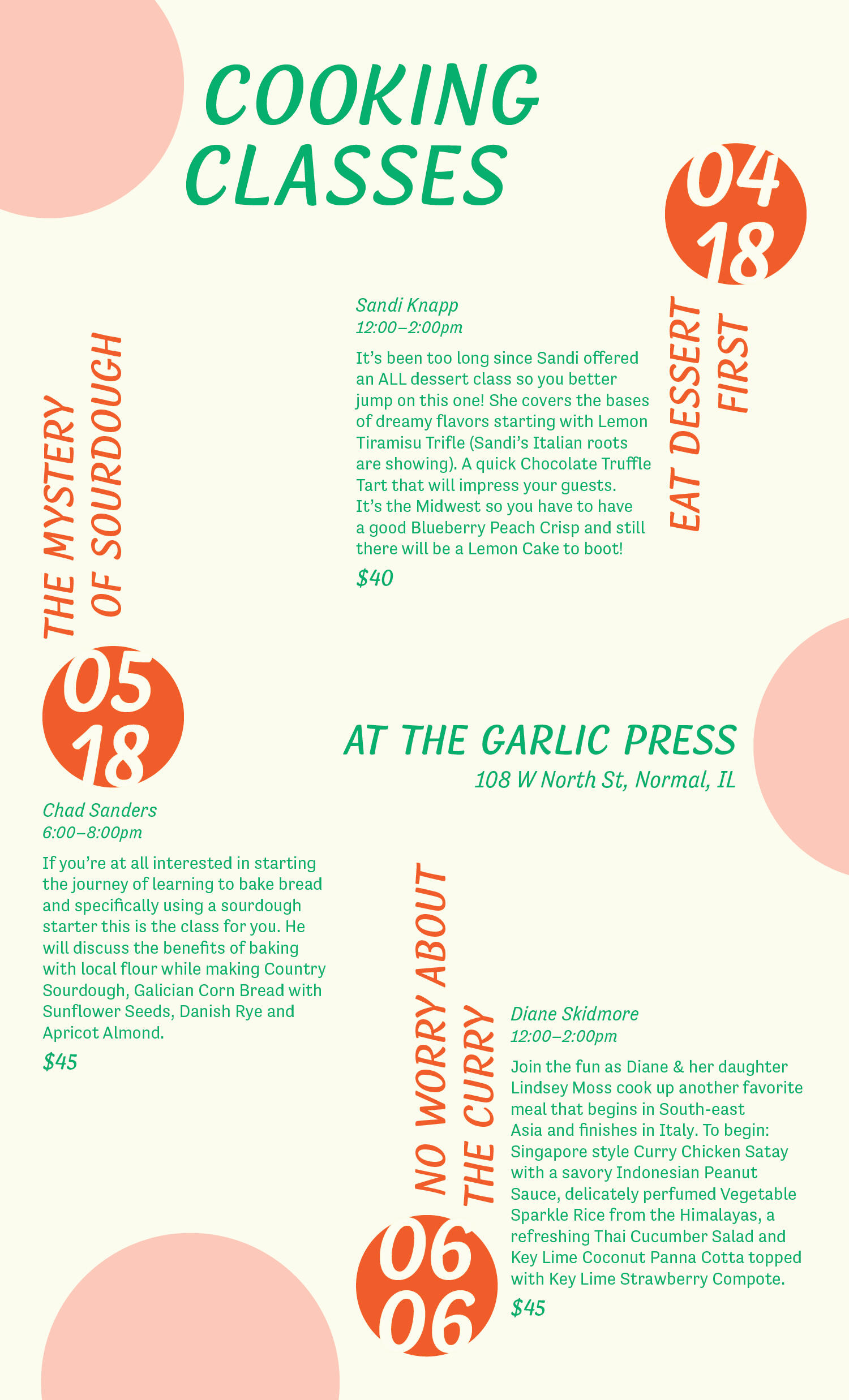 These two posters were designed for cooking classes held at a local business, The Garlic Press. These classes are for various types of dishes from multiple cultures. The company is known for having unique and fun gifts. I had fun exploring the fun spirit of this store with my usage of typography and colors.In the first poster, I selected Lemongrass for the heading, subheadings, dates, and price because of its softness and handwritten appearance. This font is intended for display use only, so I utilized Tenso for the body copy. Tenso is another sans serif font that carries the character of Lemongrass along with it. Green, orange, pink, and cream are the colors I chose to use due to their lively nature and relation to food.