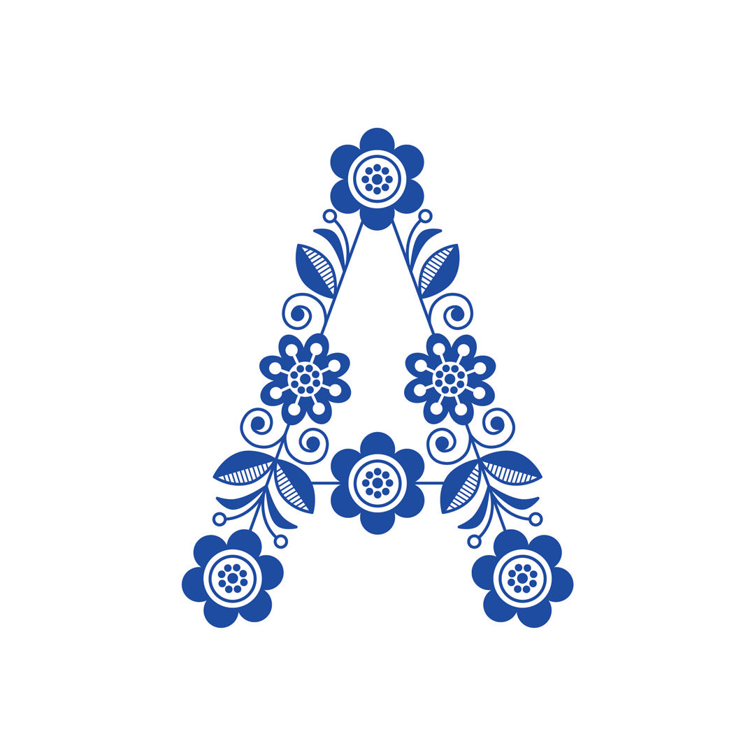 Growing up, I hadn’t known much about my family’s heritage. I only knew that my mom’s side was mainly Irish, and my dad’s side was primarily Swedish. I used ancestry.com to learn more, tracing my family tree back to the 1800s. In doing so, I realized that my genetics are around 50% Swedish, and I decided to use this part of my heritage to base my design on.I researched Swedish culture further and was fascinated with the traditional folk patterns from dishware to dresses. Many of these folk patterns consisted of floral and natural elements, and I used this motif in my design. I created various symmetrical nature-inspired elements and arranged them as balanced as possible to create each letter of the alphabet. I made all the colors royal blue because this is the primary color used in Swedish dishware and folk dresses.