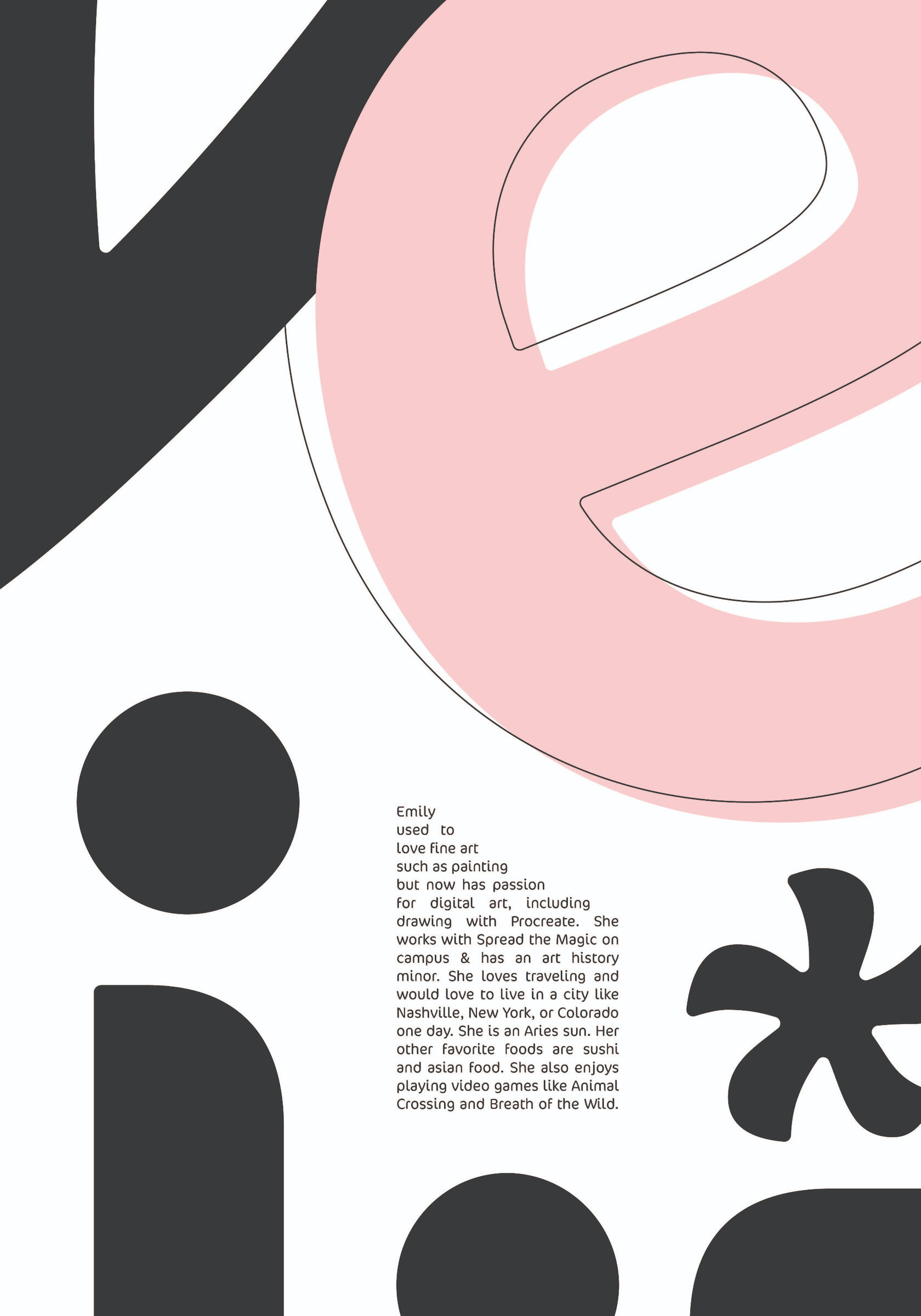 I was assigned a classmate to interview and create a typographic poster representing her. I had just met her, so I interviewed her to learn more about her personality and character traits. My initial impression of Emily was that she has a great fashion sense and wears eccentric outfits with funky earrings. She is introverted, does not enjoy being the center of attention, and is very confident. From my interview, I learned that she is fun and bold yet structured. She keeps organized with a planner but still enjoys traveling and hanging out with her friends.I chose a round font, Cocon Pro, that suited her personality and composed my design along a grid to portray her structured character trait. Using some letters from her name, I added an asterisk to represent Emily’s liveliness and mimic the fun earrings she always wears. Finally, I included a pop of her favorite color and softened the corners to portray her personality effectively.