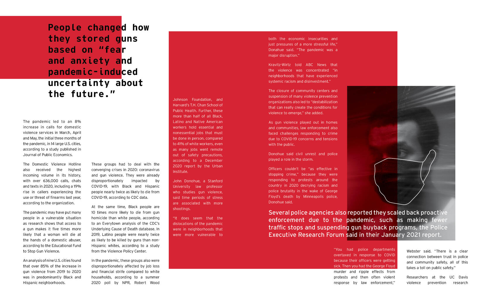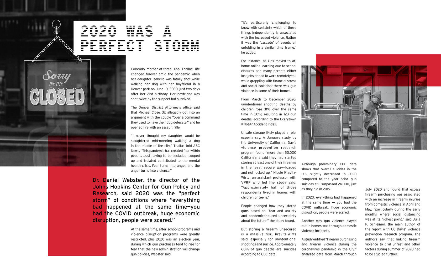 I started this project by researching a social issue I’m passionate about: gun violence. I was not surprised to find a correlation between gun violence and the coronavirus. However, I was shocked to discover that the rate of violence increased during the lockdown. It’s theorized that Covid-19 caused increased fear and anxiety, leading to gun violence rates rising in 2020.In my design of these spreads, I wanted to showcase this anxiety and violence by using high contrast, sharp shapes, and text that varies in size and breaks the grid’s boundaries.