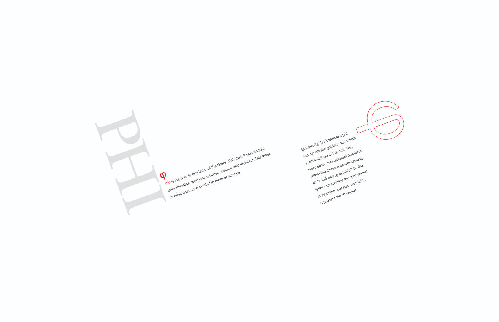 For this project, I selected a letter from the Greek alphabet, researched it, and wrote a short paragraph on the history of that letter form. I was limited to a color palette of red and black—and tints of black—to create my designs. In addition, all body copy had to be 9pt. I created three unique solutions, each distinctively different and following additional guidelines.The first spread shows the Phi symbol as the most prominent element. The name of the Greek letter is the most prominent in the next, and the final solution has the body copy as the most prominent element. These limitations and guidelines challenged me and made my hierarchy skills stronger.