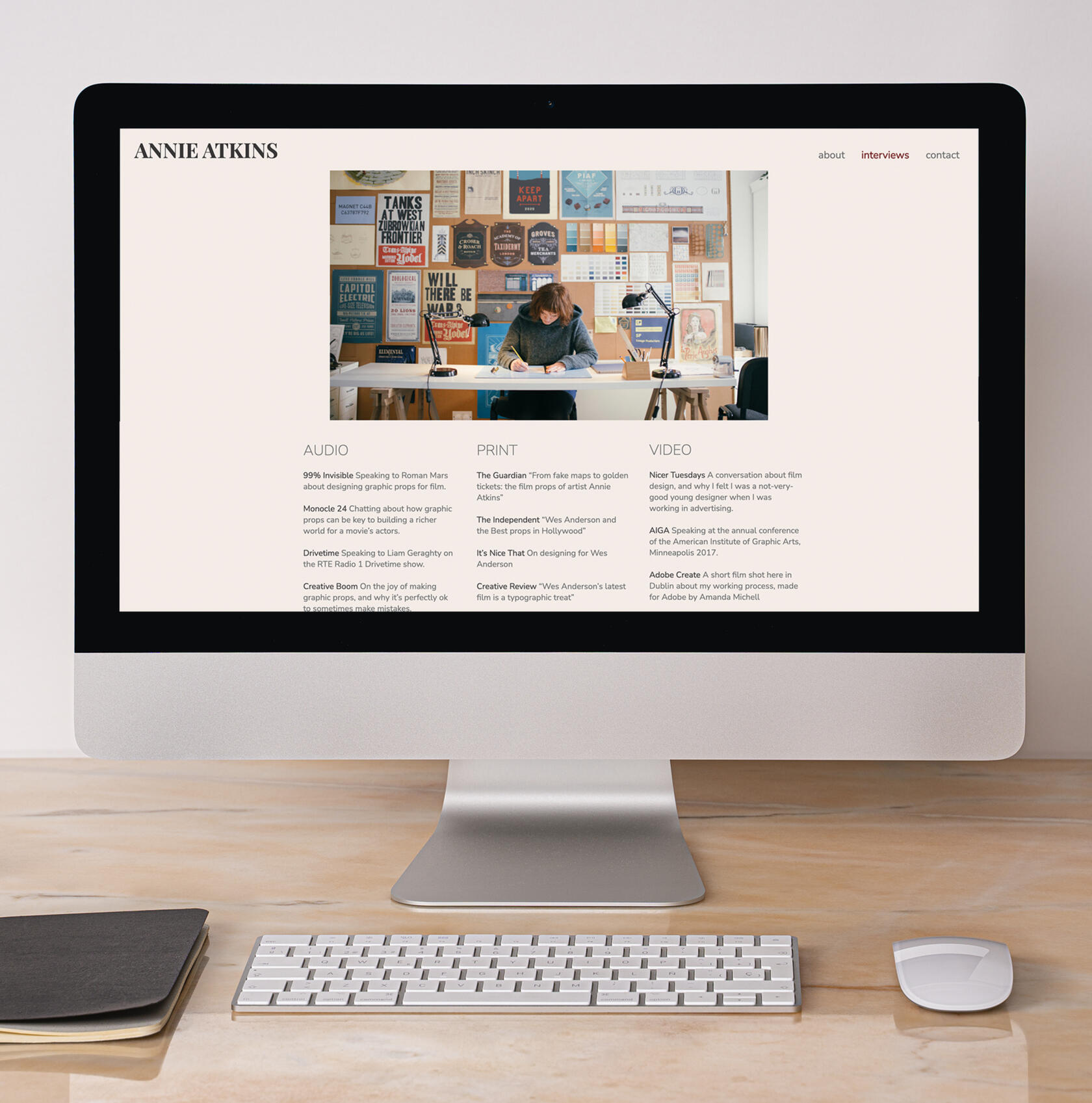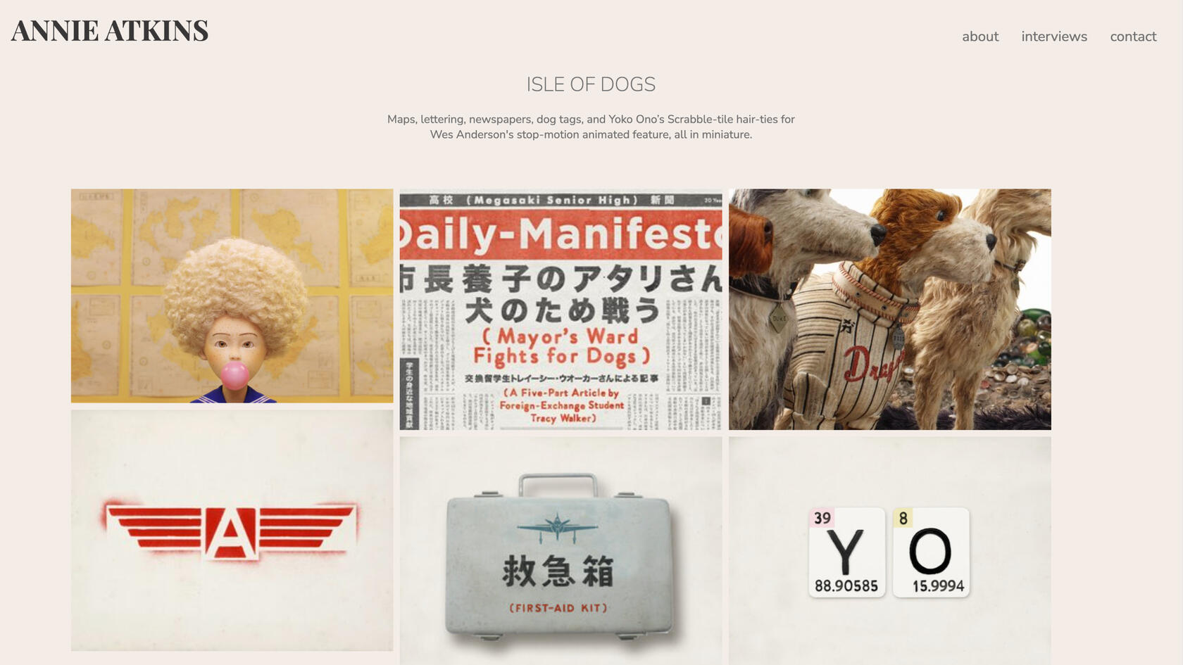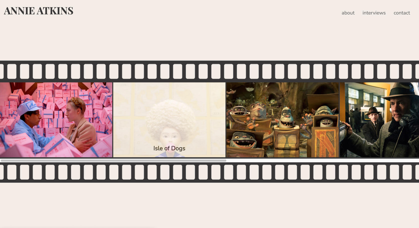 For this project, I selected a designer to research and create a website for them. I discovered Annie Atkins’ work and was immediately fascinated. I’ve watched many TV shows and movies but never thought about how a prop may be designed to fit a scene. Annie is a prop designer and designs everything on set, from signs to movie tickets to booklets and more.I was inspired by her existing website and emphasized her connection to films by including images in a film reel on the home page. Once the movie image is clicked on, you are brought to a new page showcasing the items Annie designed in it. I included another page to feature her interviews. She has various audio, print, and video interviews from which designers can take advice. Finally, I added a contact page where visitors can complete a form to get in touch. I also included social account information on this page.The biggest challenge I faced with this project was the coding itself. This website was the first one I coded from scratch, and I learned a lot. I even had fun! It was satisfying to see my vision come together.