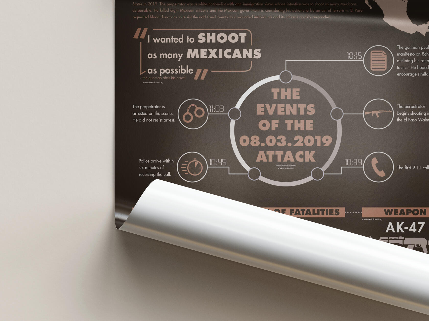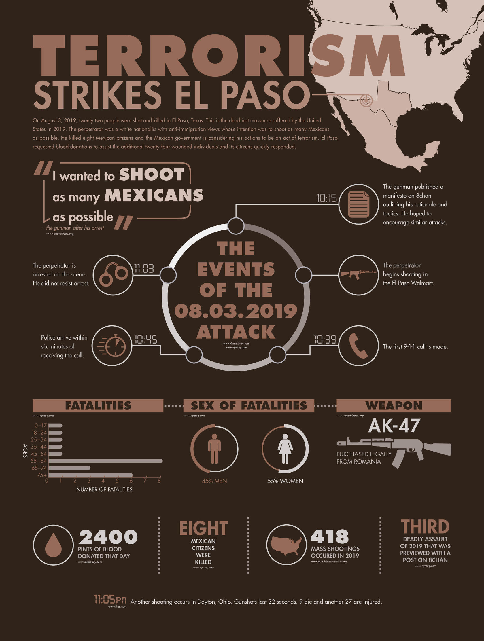 In this project, I researched and selected a nationwide issue to create an information graphic. I chose gun violence and mass shootings as my topic. My initial goal was to tackle this topic as a whole, but I realized there are so many complexities concerning it that I needed to narrow it down. I focused my infographic on the August 3, 2019 El Paso massacre.I researched the tragedy and learned everything I could about the timing of events, the shooter, and the victims. I aimed to focus on the victims and avoid sensationalizing the shooter. To accomplish this, I established content areas, developed a color system, charts, and icons to aid the poster’s visual appeal and ensured the information was communicated effectively.