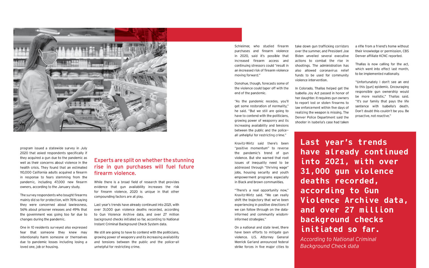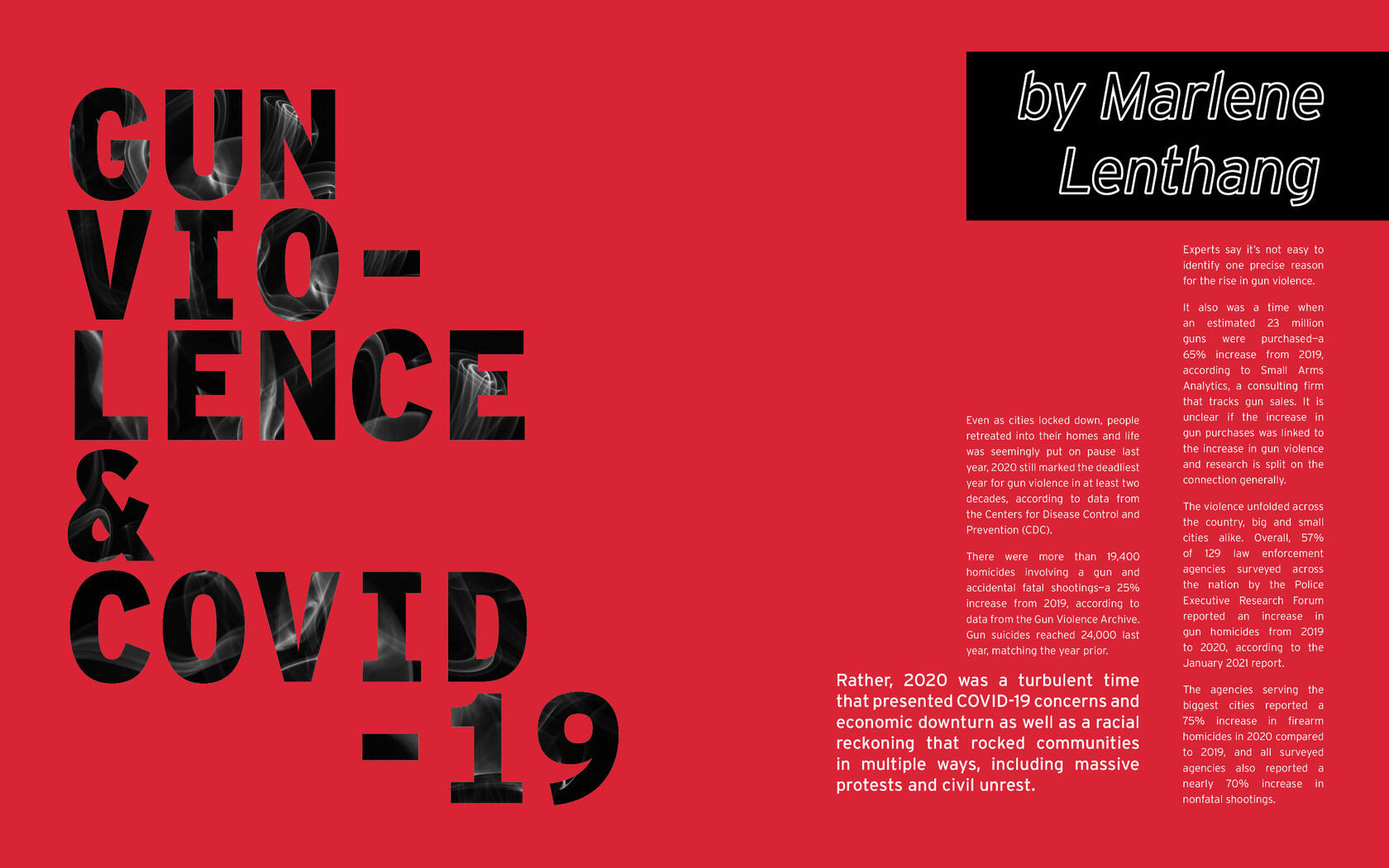 I started this project by researching a social issue I’m passionate about: gun violence. I was not surprised to find a correlation between gun violence and the coronavirus. However, I was shocked to discover that the rate of violence increased during the lockdown. It’s theorized that Covid-19 caused increased fear and anxiety, leading to gun violence rates rising in 2020.In my design of these spreads, I wanted to showcase this anxiety and violence by using high contrast, sharp shapes, and text that varies in size and breaks the grid’s boundaries.