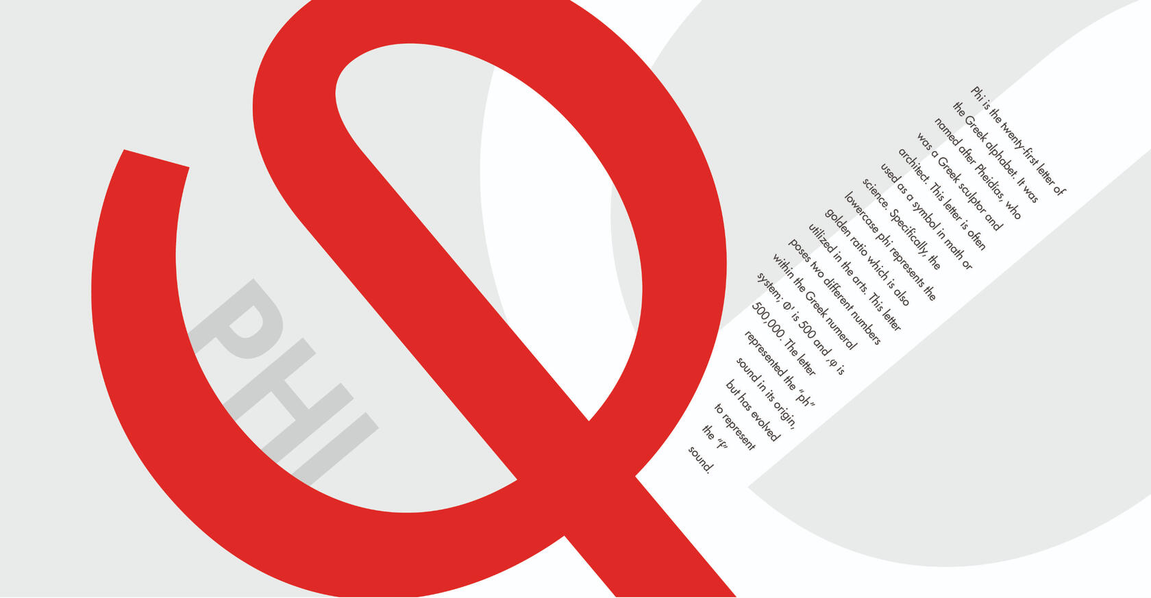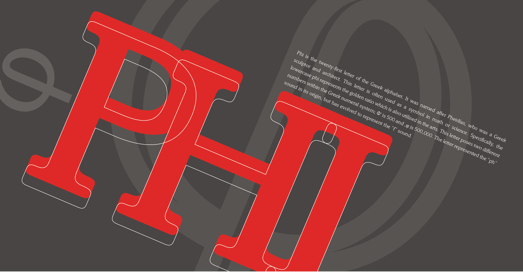 For this project, I selected a letter from the Greek alphabet, researched it, and wrote a short paragraph on the history of that letter form. I was limited to a color palette of red and black—and tints of black—to create my designs. In addition, all body copy had to be 9pt. I created three unique solutions, each distinctively different and following additional guidelines.The first spread shows the Phi symbol as the most prominent element. The name of the Greek letter is the most prominent in the next, and the final solution has the body copy as the most prominent element. These limitations and guidelines challenged me and made my hierarchy skills stronger.